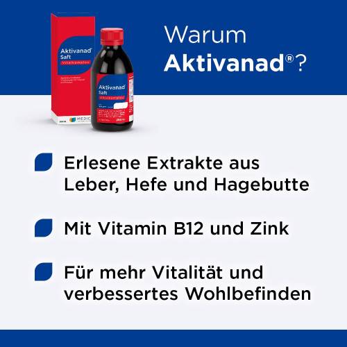 Genau hier setzt Aktivanad® Saft mit den erlesenen Extrakten aus Leber, Hefe und Hagebutte an, kombiniert in einer wohlschmeckenden und bewährten Rezeptur.
