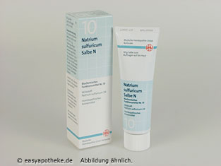 10 g Salbe enthalten: Natrium sulfuricum Trit. D4 0,1 g. Salbengrundlage: Benzylalkohol (Konservierungsmittel), Emulgierender Cetylstearylalkohol (Typ A) (Ph.Eur.), Dickflüssiges Paraffin, Octyldodecanol (Ph.Eur.), Weißes Vaselin, Gereinigtes Wasser. Enthält Cetyl-stearylalkohol.