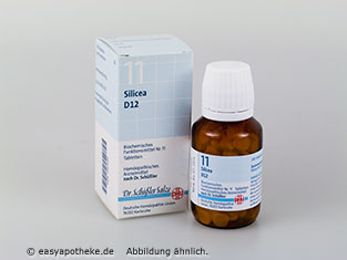 Die Biochemie DHU 11 Silicea D12 Tabletten werden zur Verbesserung der Struktur von Haut, Haaren und Gelenken eingesetzt. Die Tabletten enthalten den Naturstoff Silizium in einer homoeopathischen Verduennung. Im Koerper ist das Silizium in einer hohen Konzentration in der Hauptschlagader und der Luftroehre zu finden. Wenn ein Silizium Mangel vorliegt kommt es leicht zu einer Faltenbildung der Haut, Haarausfall und Jucken und Brennen der Haut. Die Biochemie DHU 11 Silicea D12 Tabletten sind in der Lage die Haut zu stabilisieren, dem Gewebe mehr Festigkeit und Elastizitaet zu verleihen und die Wundheilung zu foerdern.
