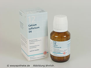 Die Biochemie DHU 12 Calcium sulfuricum D 6 Tabletten werden zur Unterstützung des Aufbaus von Knorpelgewebe angewendet. Die Tabletten enthalten den homöopathischen Wirkstoff Gips. Durch das Calcium werden die Zellmembranen stabilisiert und das Sulfat unterstützt den Aufbau der Knorpelsubstanz. Zusätzlich wird die Reinigung des Körpers positiv beeinflusst. Der Wirkstoff verfügt über entzündungshemmende und reinigende Eigenschaften. Die Biochemie DHU 12 Calcium sulfuricum D 6 Tabletten unterstützt die Bildung von Binde- und Stützgewebe des Körpers.