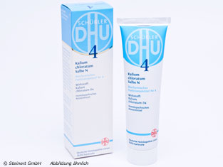 Biochemie DHU 4 Kalium chloratum N D4 Salbe enthält das Schüssler Salz Kaliumchlorid. Dieses Salz ist das sogenannte Salz der Schleimhäute. Die homöopathische Salbe kommt zur Anwendung bei Entzündungen in der 2. Phase, bei trockenen Hautausschlägen wie Kopfschuppen und Schuppenflechte, bei Verletzungen mit anschließender Schwellung und bei Warzen. Die Biochemie DHU 4 Kalium chloratum N D4 Salbe löst weißliche Ablagerungen durch Haut-und Schleimhautentzündungen auf und glättet Irritationen an Haut und Schleimhäuten.