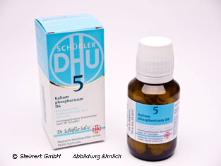 Die Biochemie DHU 5 Kalium phosphoricum D6 Tabletten werden zur natuerlichen Behandlung von Nerven-und Muskelproblemen angewendet. Die Tabletten enthalten den homoeopathischen Wirkstoff Kaliumphosphat. Das Kaliumphosphat wirkt direkt auf das vegetative und autonome Nervensystem und hilft der Muskulatur bei der Aufnahme von Sauerstoff. Wenn es zu einem Kaliumphosphat-Mangel kommt, koennen sowohl die Muskeln, als auch die Nerven ihre Funktionen nicht mehr richtig ausfuehren. Es kommt also zu einer Muskel- und Nervenschwaeche. Die Biochemie DHU 5 Kalium phosphoricum D6 Tabletten sorgen fuer eine Regulierung der Verteilung von Kalium und Phosphat im Koerper.