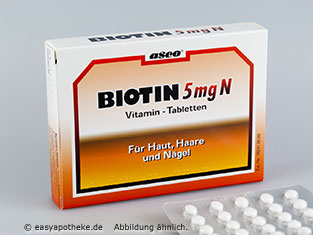 Die Biotin 5 mg N Tabletten werden zur Vorbeugung und Behandlung eines Biotin-Mangels angewendet. Die Tabletten enthalten unter anderem den natürlichen Wirkstoff Biotin. Durch das Biotin wird die Stoffwechselaktivität der Haut- und Haarwurzeln unterstützt, wodurch es zu einem ungestörten und gesunden Wachstum der Zellen kommt. Bei einem Biotin-Mangel kann es unter anderem zu Hauterkrankungen, Haarausfall, Appetitverlust, Müdigkeit und Muskelschmerzen kommen. Gründe für einen Biotin-Mangel können zum Beispiel eine Mangelernährung oder Störungen der Darmflora sein. Die Biotin 5 mg N Tabletten sind in der Lage die Regeneration der schnell wachsenden Zellen von Haut, Haaren und Nägeln zu unterstützen.