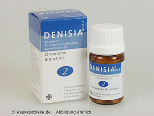 Die Denisia 2 chronische Bronchitis Tabletten werden zur natürlichen Behandlung einer chronischen Bronchitis oder einer verschleppten Atemweginfektion angewendet. Die Tabletten enthalten den Wirkstoff Goldschwefel in einer homöopathischen Verdünnung. Dieser enthaltene Wirkstoff ist in der Lage zähe Schleimansammlungen in den Bronchien und den oberen Luftwegen zu lösen. Es kommt zu einer positiven Beeinflussung von quälenden Husten und Verschleimungen. Die Denisia 2 chronische Bronchitis Tabletten helfen auch bei morgendlichen Hustenanfällen, infolge von einem zu starken Zigarettenkonsum.