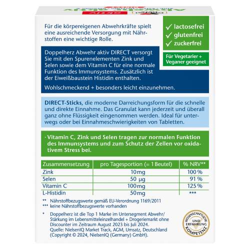 Doppelherz Abwehr aktiv DIRECT versorgt Sie nicht nur mit den Spurenelementen Zink und Selen sowie dem Vitamin C, die zur normalen Funktion des Immunsystems beitragen, sondern schmeckt auch ausgezeichnet.