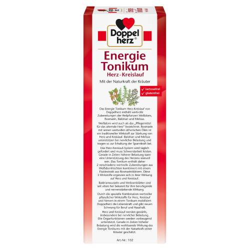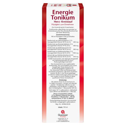 Energie Tonikum Herz-Kreislauf, Flüssigkeit zum Einnehmen. Für Erwachsene. Wirkstoffe: Fluidextrakt aus Melissenblättern, Fluidextrakt aus Rosmarinblätter, Fluidextrakt aus Baldrianwurzel, Fluidextrakt aus Weißdornfrüchten, Dickextrakt aus Weißdornfrüchten. Anwendungsgebiet: Traditionelles pflanzliches Arzneimittel angewendet zur Unterstützung der Herz-Kreislauf-Funktion bei nervlicher Belastung ausschließlich aufgrund langjähriger Anwendung. Warnhinweise: Enth. 2,9 g Alkohol (Ethanol) bei jeder Einnahme (1 Messbecher = 20 ml) entspr. 17 Vol.-% Alkohol, Invertzuckerlösung und Kaliummetabisulfit (Ph.Eur.).