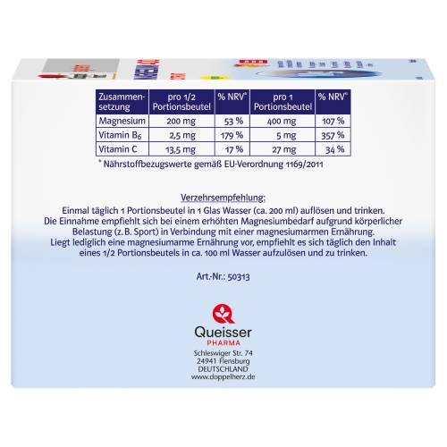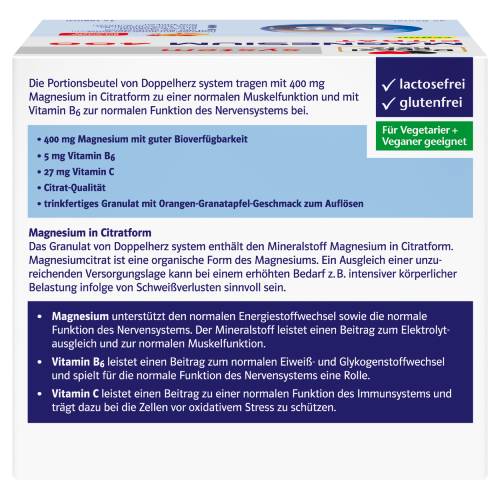 Die Portionsbeutel von Doppelherz system tragen mit 400 mg Magnesium in Citratform zu einer normalen Muskelfunktion und mit Vitamin B6 zur normalen Funktion des Nervensystems bei.