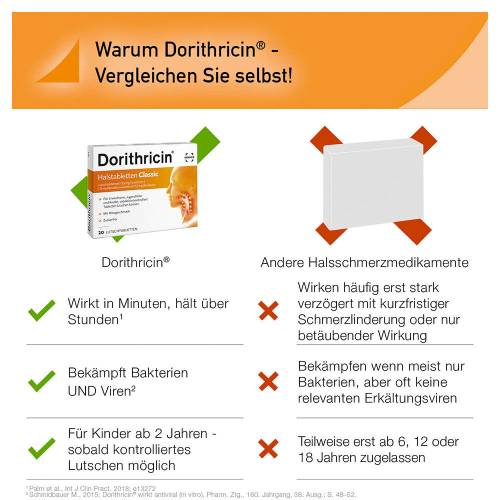 Der Vorteil: Dorithricin® bekämpft Halsschmerzen und Schluckbeschwerden schnell und langanhaltend, ohne dass dabei ein unangenehmes Taubheitsgefühl im Mund entsteht.