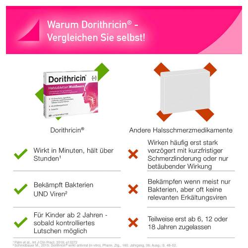 Der Vorteil: Dorithricin® bekämpft Halsschmerzen und Schluckbeschwerden schnell und langanhaltend, ohne dass dabei ein unangenehmes Taubheitsgefühl im Mund entsteht.