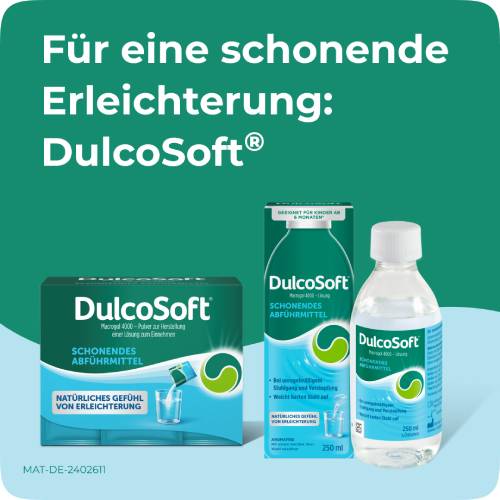 Wer regelmäßig unter trockenem, hartem Stuhl oder unter Verstopfung leidet, weiß, wie unangenehm dies im Alltag sein kann. Denn ein schmerzhafter, erschwerter Stuhlgang ist äußerst lästig und die Beschwerden können sich auch auf das Wohlbefinden auswirken. Hier kann DulcoSoft® Pulver helfen, die natürliche Darmtätigkeit zu unterstützen. Der Inhaltsstoff Macrogol 4000 setzt dort an, wo es nötig ist: Er bindet Flüssigkeit im Darm. Dies macht den harten Stuhl weicher, fördert schonend die Darmtätigkeit und erleichtert so den Stuhlgang ohne plötzlichen Drang.