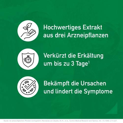 Die pflanzlich hochwirksame 5-fach konzentrierte Kombination, die die antiviralen, immunstimulierenden Eigenschaften der drei Arzneipflanzen vereint, greift die Erkältungserreger von 3 Seiten direkt an.