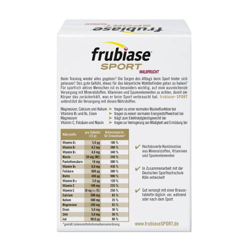 Für sportlich aktive Menschen ist es besonders wichtig, auf eine ausreichende Versorgung mit Nährstoffen zu achten. Um den erhöhten Bedarf zu decken, versorgt das erfrischende Mineralgetränk frubiase® SPORT in den Geschmacksrichtungen Orange und Waldfrucht den Körper mit einer einzigartigen und hochdosierten Kombination aus wichtigen Mineralstoffen, Vitaminen und Spurenelementen. Denn ohne diese Nährstoffe können viele Stoffwechsel-Prozesse im Körper nicht optimal ablaufen. frubiase® SPORT trägt zur Verringerung von Müdigkeit und Ermüdung während des Sports sowie zur Muskelfunktion und dem Energiestoffwechsel bei. Zusätzlich wird das Elektrolytgleichgewicht unterstützt. Gut versorgt mit nur einer Brausetablette täglich.