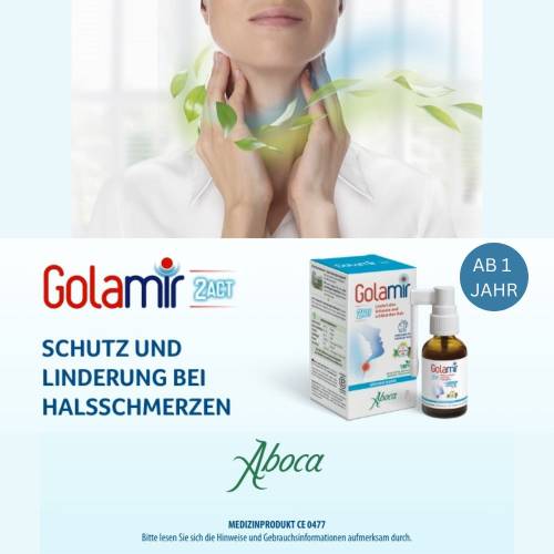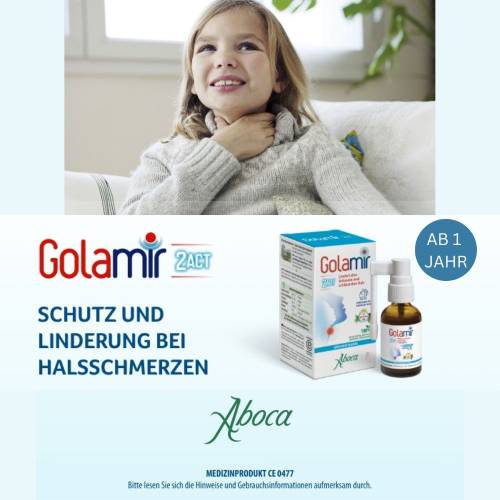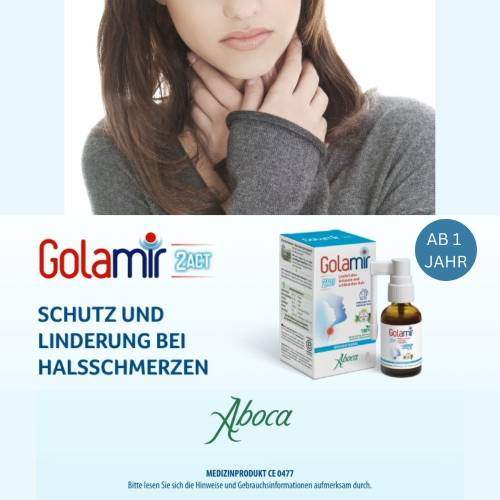 Geeignet bei Halsschmerzen, die von externen Reizstoffen (Viren, Bakterien, Allergenen, Rauch, Smog, Staub) verursacht sein können. Das Produkt eignet sich auch bei Erkältungszuständen, bei denen die in den Hals fließende Nasensekretion zu Reizungen führen kann. Geeignet für Erwachsene und Kinder ab 6 Jahren. Golamir 2Act kann aufgrund seines Wirkungsmechanismus auch in Verbindung mit pharmakologischen, vom Arzt verschriebenen Behandlungen verwendet werden.