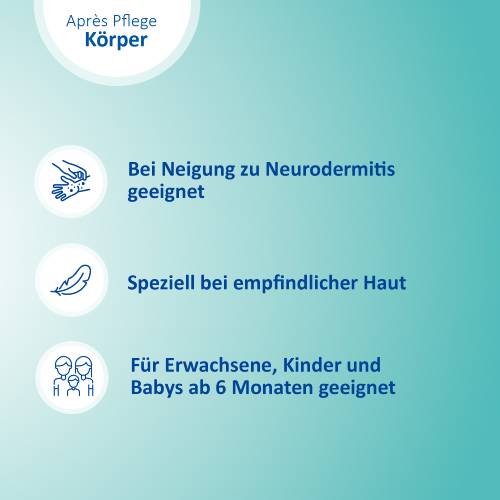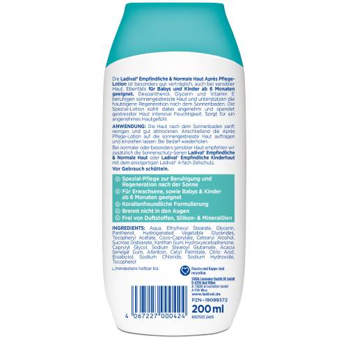 Die Ladival® Après Pflege-Lotion für empfindliche und normale Haut bietet eine intensive Pflege nach dem Sonnenbaden. Ihre Öl-in-Wasser Emulsion sorgt für ein angenehmes Hautgefühl und pflegt, kühlt und beruhigt mit regenerierenden Inhaltsstoffen wie Panthenol, Glycerin und Vitamin E sanft die Haut und fördert deren Erholung. Die besonders milde Rezeptur ist ideal für sensible Haut und Neigung zu Neurodermitis, brennt nicht in den Augen und eignet sich ebenfalls für Babys und Kinder ab 6 Monaten.