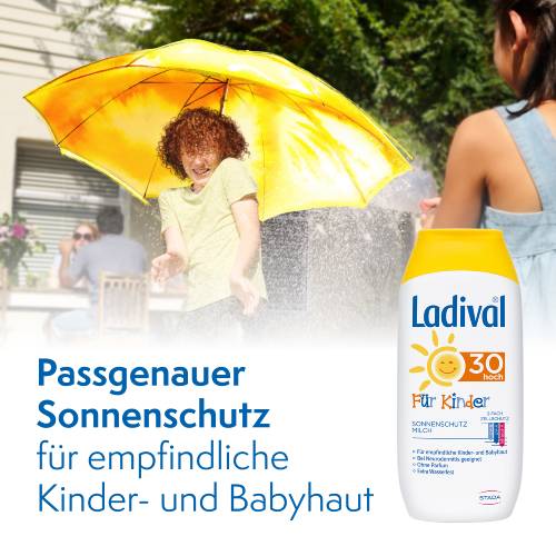 Die Ladival Kinder Sonnenmilch LSF 30 wird zum Schutz von empfindlicher Kinderhaut vor einer intensiven Sonneneinstrahlung angewendet. Die Sonnenmilch enthält eine Kombination aus organischen und mineralischen Filtern, Vitamin E und pflegende Öle. Durch den besonderen Infrarot-Schutz-Komplex werden Langzeitschäden durch Infrarot-A-Strahlen vermieden. Das Mittel bietet eine hohe Wasserfestigkeit und einen höchstmöglichen Schutz für die zarte Kinderhaut. Die Sonnenmilch schützt sofort nach dem Auftragen. Die Ladival Kinder Sonnenmilch LSF 30 ist extra auf die Bedürfnisse von kleineren Kindern zugeschnitten.