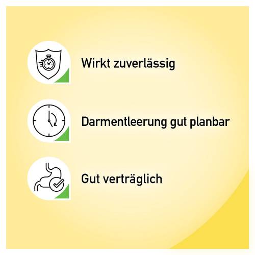 Der Wirkstoff verhindert, dass aus dem Darminhalt Wasser und Salze entzogen werden. Gleichzeitig fördert er das Einströmen von Wasser und Salzen in den Darm. Dadurch gewinnt der Darminhalt an Volumen und wird weicher, was zu einem Stuhldrang und einer erleichterten Stuhlentleerung führt.