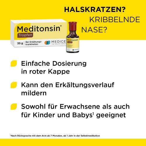 Nach Rücksprache mit dem Arzt kann Meditonsin® bereits Säuglingen ab sieben Monaten verabreicht werden. Kleinkinder ab einem Jahr dürfen auch in der Selbstmedikation mit Meditonsin® behandelt werden.