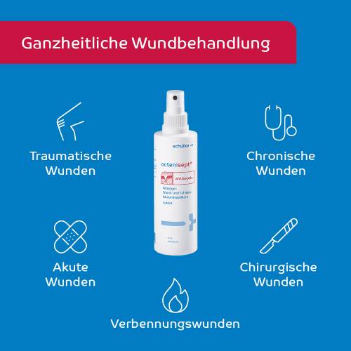 Bei der Octenisept mit Sprühpumpe Lösung handelt es sich um ein modernes, sehr wirksames und gut verträgliches Wunddesinfektionsmittel. Die Octenisept mit Sprühpumpe Lösung umfasst ein breites antiseptisches Wirkungsspektrum, gute Haut- und Schleimhautverträglichkeit und ist bereits für Säuglinge und Frühgeborene geeignet. Neben der Wundbehandlung kennzeichnet die antiseptische Behandlung von Schleimhaut und angrenzender Haut vor operativen Eingriffen und bei der Therapie von Pilzerkrankungen den breiten Anwendungsbereich.