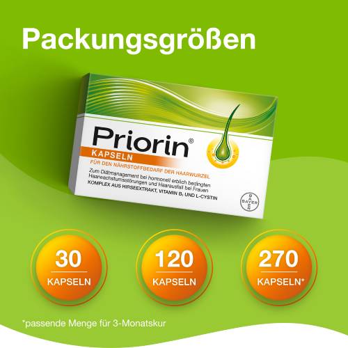 Zwar treten die ersten Verbesserungen bereits nach wenigen Wochen ein, doch wachsen Haare nur circa 0,3 Millimeter pro Tag. Daher sollten Priorin® Kapseln mindestens über einen Zeitraum von 12 Wochen eingenommen werden. Hat sich nach 12 Wochen noch kein Effekt eingestellt, sollte weiter untersucht werden, ob vielleicht ein anderer Haarausfalltyp als der hormonell bedingte für den Haarausfall verantwortlich ist.