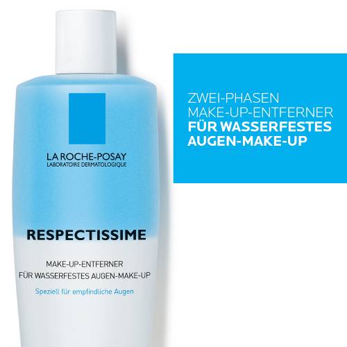 Der RESPECTISSIME AUGEN-MAKE-UP-ENTFERNER von La Roche-Posay entfernt wasserfestes Augen-Make-up sanft und gründlich. Der wasserfeste Make-up-Entferner ist durch seine schonende Formel besonders für empfindliche Augen und Kontaktlinsenträgerinnen geeignet. Der RESPECTISSIME AUGEN-MAKE-UP-ENTFERNER überzeugt durch seine duale Wirkung: In der ersten Phase der Anwendung wird wasserfester Mascara durch Fett gelöst. In der zweiten Phase entfernt der Wasseranteil des Produktes den restlichen Fettanteil und letzte Make-up-Partikel. Das Make-up lässt sich sanft und ohne Reiben entfernen, sensible Augen werden geschont. Durch seine wenigen, essentiellen und auf Allergien getesteten Inhaltsstoffe ist RESPECTISSIME von La Roche-Posay auch bei empfindlicher Haut und für jeden Hauttyp geeignet.