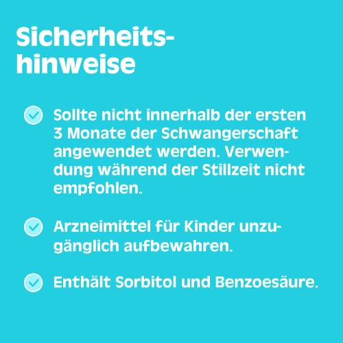 Anwendung zur schleimlösenden Behandlung bei Erkrankungen der Bronchien und der Lunge mit zähem Schleim. Wenn Sie sich nach 4 – 5 Tagen nicht besser oder gar schlechter fühlen, müssen Sie sich an einen Arzt wenden. Hinweis: Enthält Sorbitol und Benzoesäure.