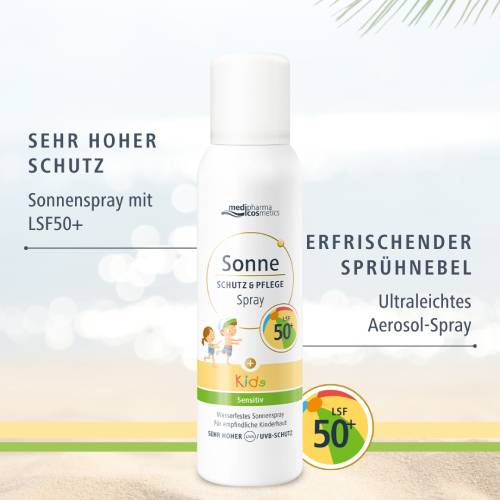 Das wasserfeste Sonnenspray Schutz & Pflege Kids mit LSF 50+ von medipharma cosmetics für empfindliche Kinderhaut ist eine leichte Emulsion mit sehr hohem und zuverlässigem Sonnenschutz.