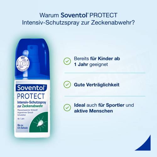 Wasserbeständig, schwitzfest und gut verträglich: Soventol® Protect leistet eine effektive Unterstützung zur Zeckenabwehr. Denn das Intensiv-Schutzspray kann Zecken bis zu 6 Stunden lang fernhalten.