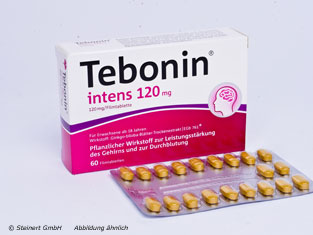 Die Tebonin intens 120 mg Filmtabletten werden zur natürlichen Behandlung von Hirnleistungsstörungen, Gleichgewichtsstörungen, Tinnitus und Demenzerkrankungen angewendet. Die Filmtabletten enthalten einen Trockenextrakt aus Ginkgo biloba Blättern. Der Wirkstoff ist in der Lage die Bindungsstellen für Botenstoffe im Gehirn zu stimulieren, wodurch es zu einer Verbesserung der Reizleitung zu den Nerven kommt. Die Tebonin intens 120 mg Filmtabletten können Schwindel kompensieren und Ohrensausen verringern.