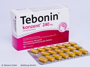Die Tebonin Konzent 240 mg Filmtabletten werden zur Behandlung einer nachlassenden Leistungsfähigkeit und Konzentrationsstörungen angewendet. Die Filmtabletten einen Spezialextrakt aus Ginkgo biloba Blättern. Dieser Wirkstoff kann Störungen in den Mitochondrien aufhalten und bereits geschädigte Mitochondrien regenerieren. Es kommt dazu, dass den Nervenzellen mehr Energie zur Verfügung steht. Eine Verbesserung der Konzentration, der Merkfähigkeit und der Arbeitsleistung kann bei einer regelmäßigen Anwendung bemerkt werden. Die Tebonin Konzent 240 mg Filmtabletten stärken die Nervenzellen, wodurch das Gedächtnis besser funktioniert.