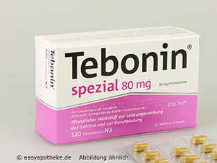 Die Tebonin spezial 80 mg Filmtabletten werden zur symptomatischen Behandlung von hirnorganisch bedingten Leistungsstörungen im Rahmen eines therapeutischen Gesamtkonzeptes bei dementiellen Syndromen mit Gedächtnisstörungen, Konzentrationsstörungen, depressive Verstimmung, Schwindel, Ohrensausen, Kopfschmerzen angewendet. Die Filmtabletten enthalten einen Ginkgo-Spezialextrakt. Der Wirkstoff verbessert die Fließeigenschaften des Blutes und erhöht die Strömungsgeschwindigkeit, besonders im Bereich kleiner und kleinster Blutgefäße. Tebonin spezial 80 mg führt zu einer besseren Versorgung des Gewebes mit Blut und Sauerstoff sowie wichtigen Energiestoffen und schützt die Gewebszellen vor den schädigenden Einflüssen des Sauerstoffmangels.