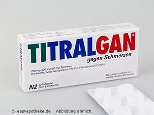 Die Titralgan Tabletten gegen Schmerzen werden zur Behandlung von leichten bis mittelschweren Schmerzen angewendet. Die Tabletten enthalten eine Kombination der drei Wirkstoffe Acetylsalicylsäure, Paracetamol und Coffein. Die Acetylsalicylsäure und das Paracetamol verfügen über schmerzstillende, fiebersenkende und entzündungshemmende Eigenschaften. Das Coffein verstärkt und beschleunigt die Wirkung der beiden anderen Wirkstoffe und hilft bei Ermüdungserscheinungen. Die Titralgan Tabletten gegen Schmerzen helfen schnell und zuverlässig gegen verschiedene Arten von Schmerzen.