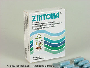ZINTONA® ist ein natürliches Präparat mit den guten und seit Jahrtausenden bekannten positiven Wirkungen des Ingwers. ZINTONA® wird aus qualitativ hochwertigem pulverisiertem Ingwerwurzelstock hergestellt, jede Kapsel enthält 250 mg dieses Wirkstoffs. ZINTONA® wird angewandt bei: Reisekrankheit (besonders für Kinder geeignet) ZINTONA®Anwendung bei: Schwangerschaftserbrechen/-übelkeit sollte ? wie auch die Anwendung jeglicher anderer Medikamente ? mit dem behandelnden Arzt besprochen werden. ZINTONA® entfaltet seine Wirkung bereits 30 Minuten nach der Einnahme. ZINTONA®verursacht keine: Neben- und/oder Wechselwirkungen wie z.B.: Wahrnehmungsbeeinträchtigung, Mundtrockenheit, Magen-Darm-Probleme. (Im Gegensatz zu den meisten chemischen Präparaten gegen Reisekrankheit)